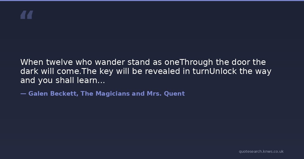 When twelve who wander stand as oneThrough the door the dark will come.The key will be revealed in turnUnlock the way and you shall learn...