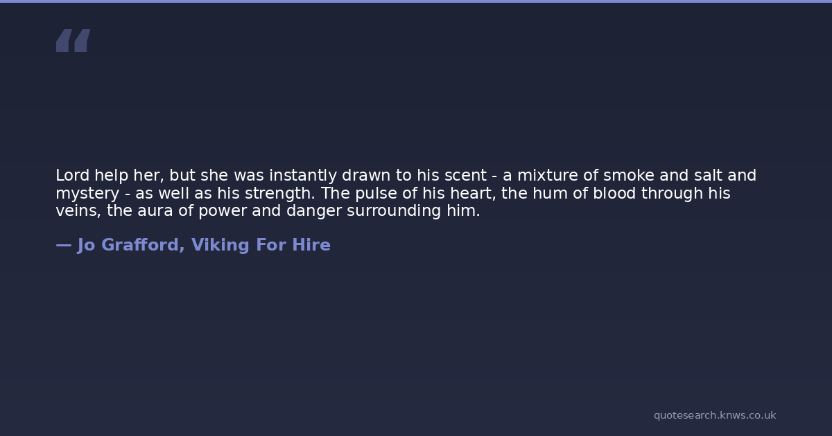 Lord help her, but she was instantly drawn to his scent - a mixture of smoke and salt and mystery - as well as his strength. The pulse of his heart, the hum of blood through his veins, the aura of power and danger surrounding him.