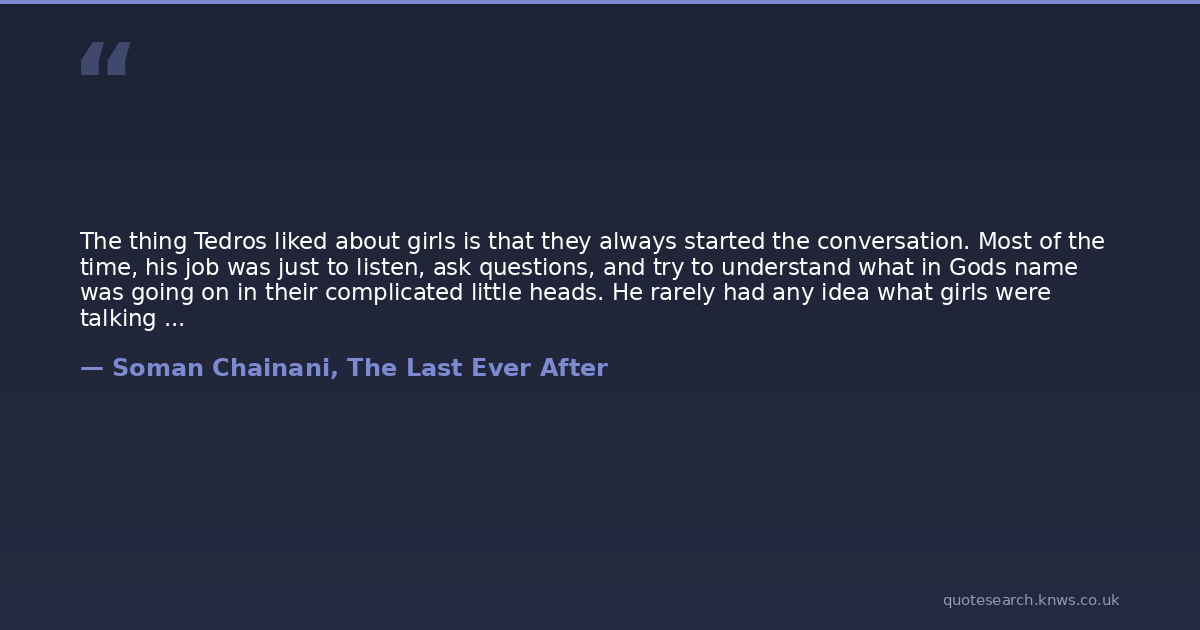 The thing Tedros liked about girls is that they always started the conversation. Most of the time, his job was just to listen, ask questions, and try to understand what in Gods name was going on in their complicated little heads. He rarely had any idea what girls were talking about or why they made everything so torturous in their logic, so playing the role of the strong, silent type usually gave him time to catch up.