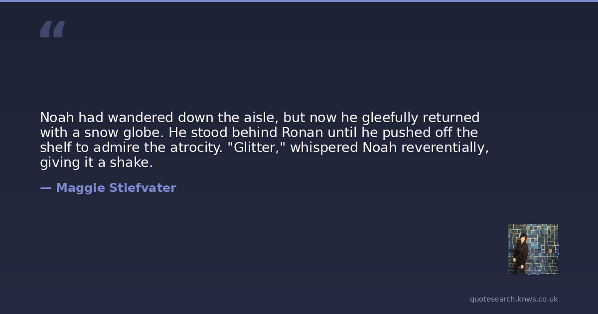 Noah had wandered down the aisle, but now he gleefully returned with a snow globe. He stood behind Ronan until he pushed off the shelf to admire the atrocity. "Glitter," whispered Noah reverentially, giving it a shake.
