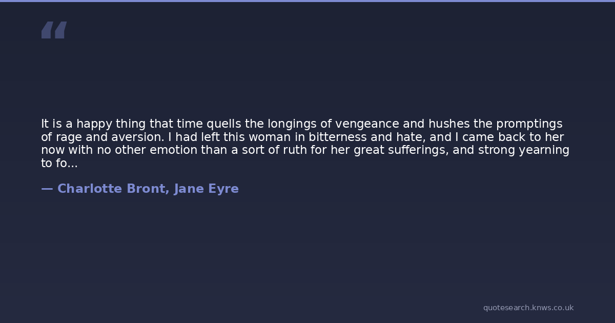It is a happy thing that time quells the longings of vengeance and hushes the promptings of rage and aversion. I had left this woman in bitterness and hate, and I came back to her now with no other emotion than a sort of ruth for her great sufferings, and strong yearning to forget and forgive all injuries - to be reconciled and clasp hands in amity.
