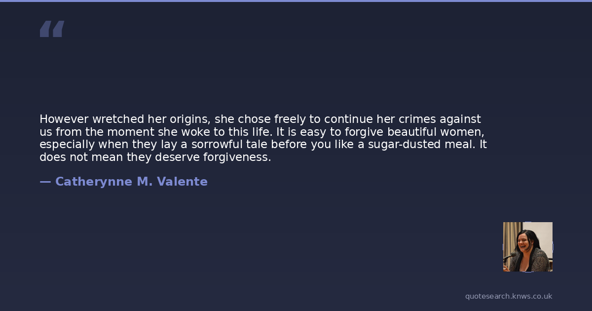 However wretched her origins, she chose freely to continue her crimes against us from the moment she woke to this life. It is easy to forgive beautiful women, especially when they lay a sorrowful tale before you like a sugar-dusted meal. It does not mean they deserve forgiveness.