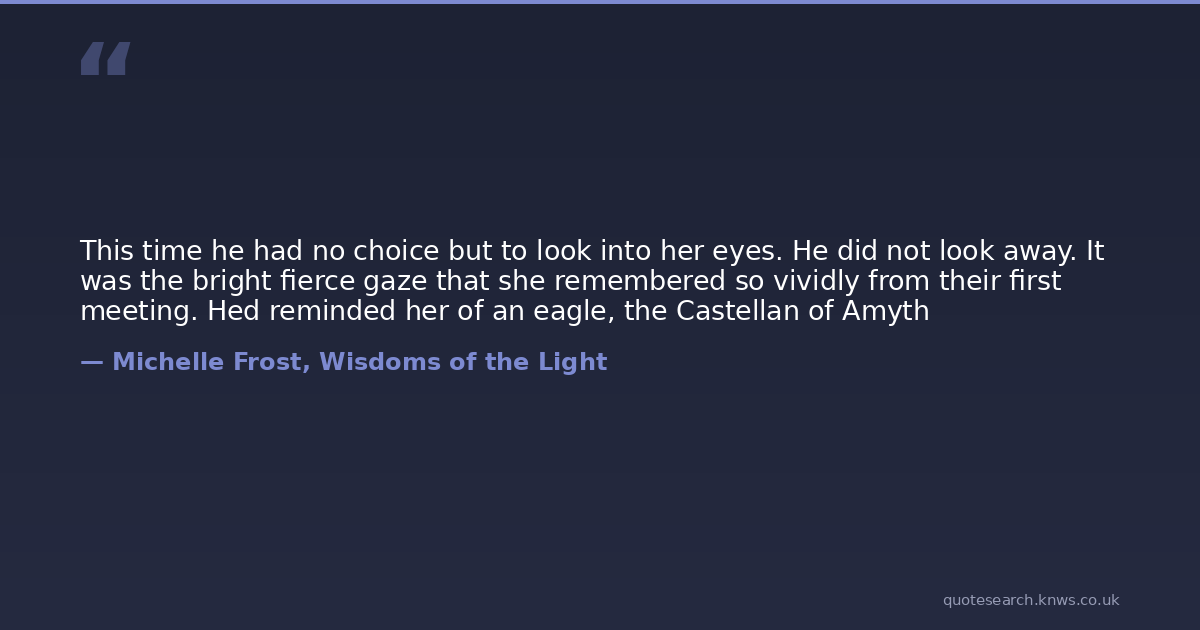 This time he had no choice but to look into her eyes. He did not look away. It was the bright fierce gaze that she remembered so vividly from their first meeting. Hed reminded her of an eagle, the Castellan of Amyth