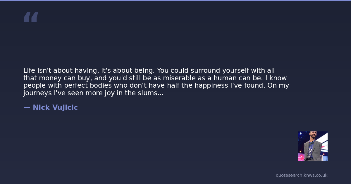Life isn't about having, it's about being. You could surround yourself with all that money can buy, and you'd still be as miserable as a human can be. I know people with perfect bodies who don't have half the happiness I've found. On my journeys I've seen more joy in the slums of Mumbai and the orphanages of Africa than in wealthy gated communities and on sprawling estates worth millions. Why is that? You'll find contentment when your talents and passion are completely engaged, in full force. Recognise instant self-gratification for what it is. Resist the temptation to grab for material objects like the perfect house, the coolest clothes or the hottest car. The if I just had X, I would be happy syndrome is a mass delusion. When you look for happiness in mere objects, they are never enough. Look around. Look within.