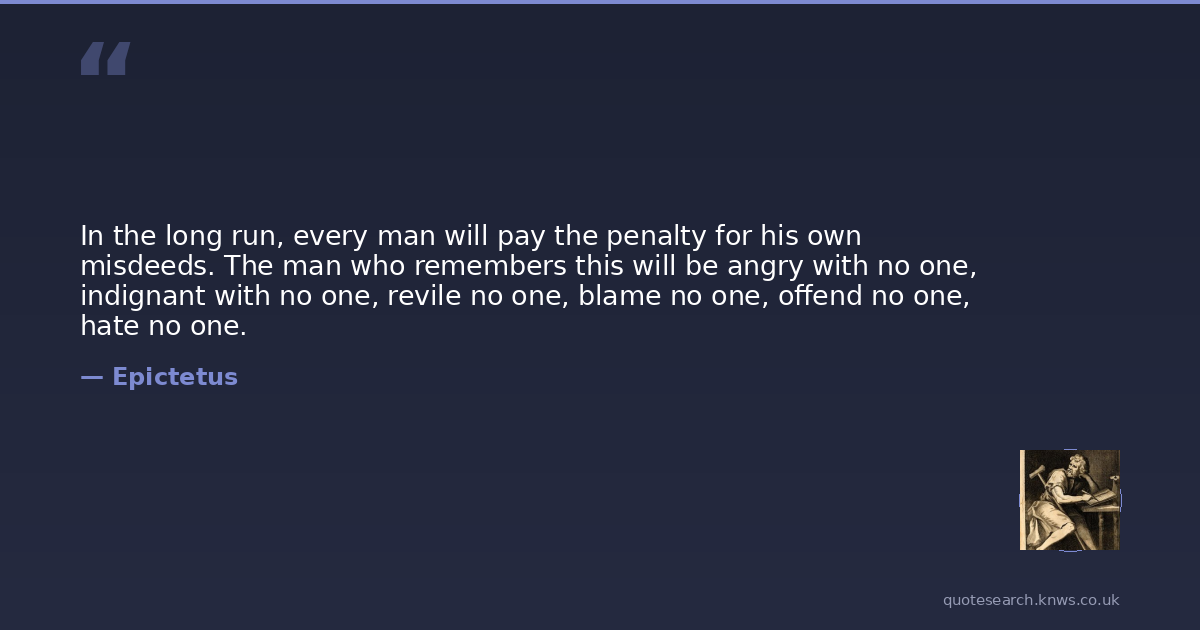 In the long run, every man will pay the penalty for his own misdeeds. The man who remembers this will be angry with no one, indignant with no one, revile no one, blame no one, offend no one, hate no one.