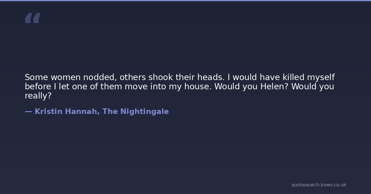 Some women nodded, others shook their heads. I would have killed myself before I let one of them move into my house. Would you Helen? Would you really?
