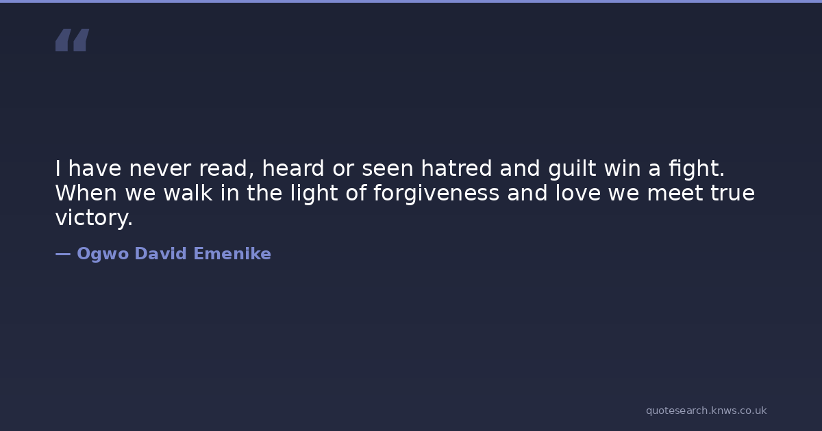 I have never read, heard or seen hatred and guilt win a fight. When we walk in the light of forgiveness and love we meet true victory.