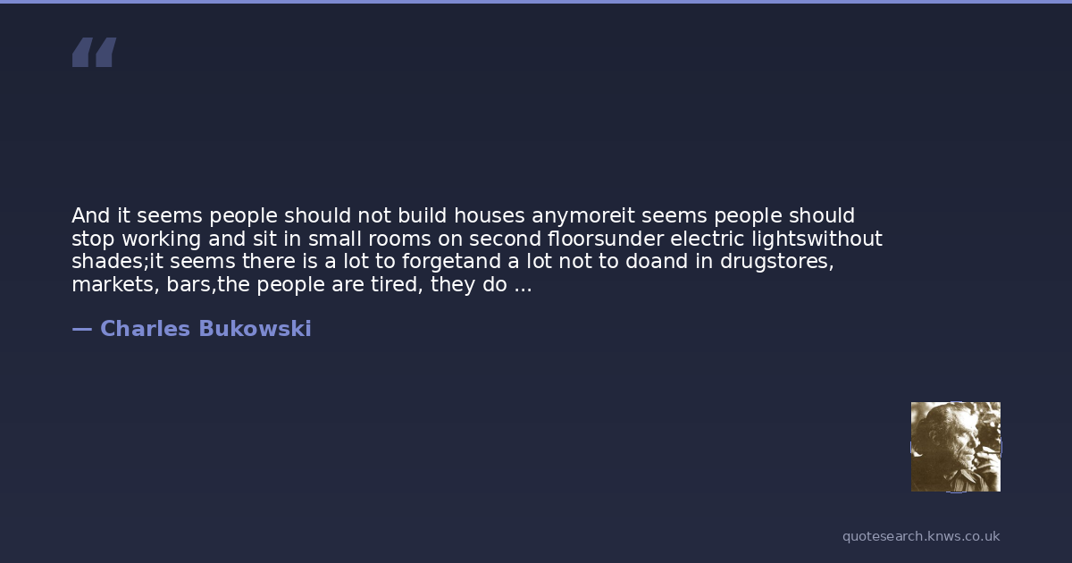 And it seems people should not build houses anymoreit seems people should stop working and sit in small rooms on second floorsunder electric lightswithout shades;it seems there is a lot to forgetand a lot not to doand in drugstores, markets, bars,the people are tired, they do not want to move, and I stand there at nightand look through this house and the house does not want to be built
