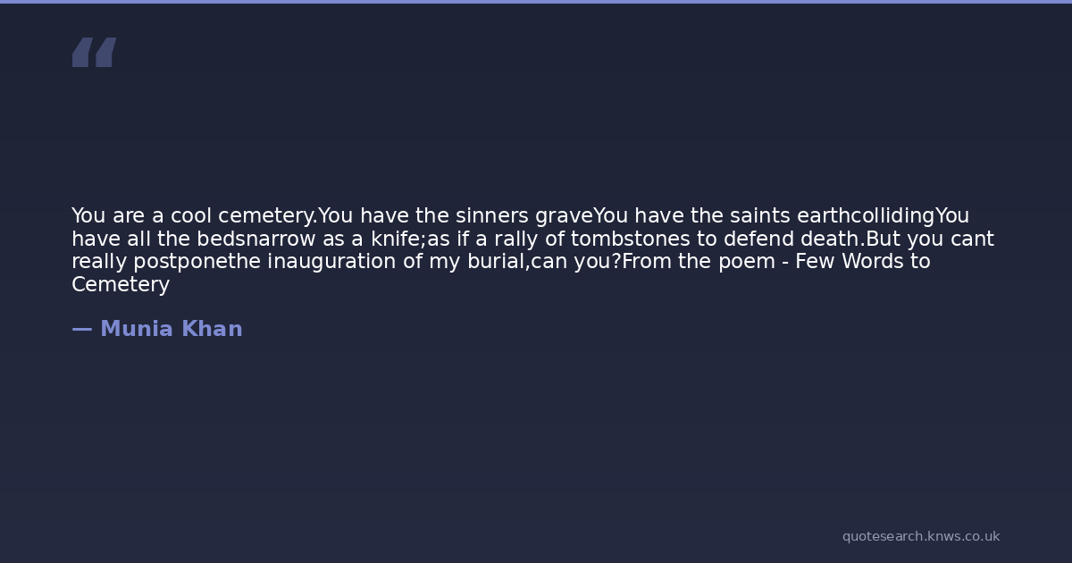 You are a cool cemetery.You have the sinners graveYou have the saints earthcollidingYou have all the bedsnarrow as a knife;as if a rally of tombstones to defend death.But you cant really postponethe inauguration of my burial,can you?From the poem - Few Words to Cemetery