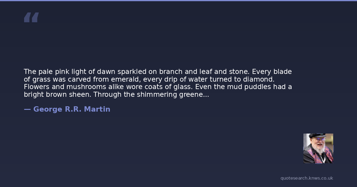 The pale pink light of dawn sparkled on branch and leaf and stone. Every blade of grass was carved from emerald, every drip of water turned to diamond. Flowers and mushrooms alike wore coats of glass. Even the mud puddles had a bright brown sheen. Through the shimmering greenery, the black tents of his brothers were encased in a fine glaze of ice. So there is magic beyond the Wall after all.