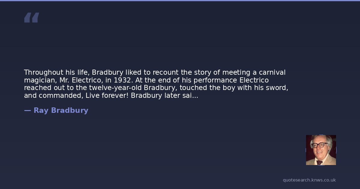 Throughout his life, Bradbury liked to recount the story of meeting a carnival magician, Mr. Electrico, in 1932. At the end of his performance Electrico reached out to the twelve-year-old Bradbury, touched the boy with his sword, and commanded, Live forever! Bradbury later said, I decided that was the greatest idea I had ever heard. I started writing every day. I never stopped.