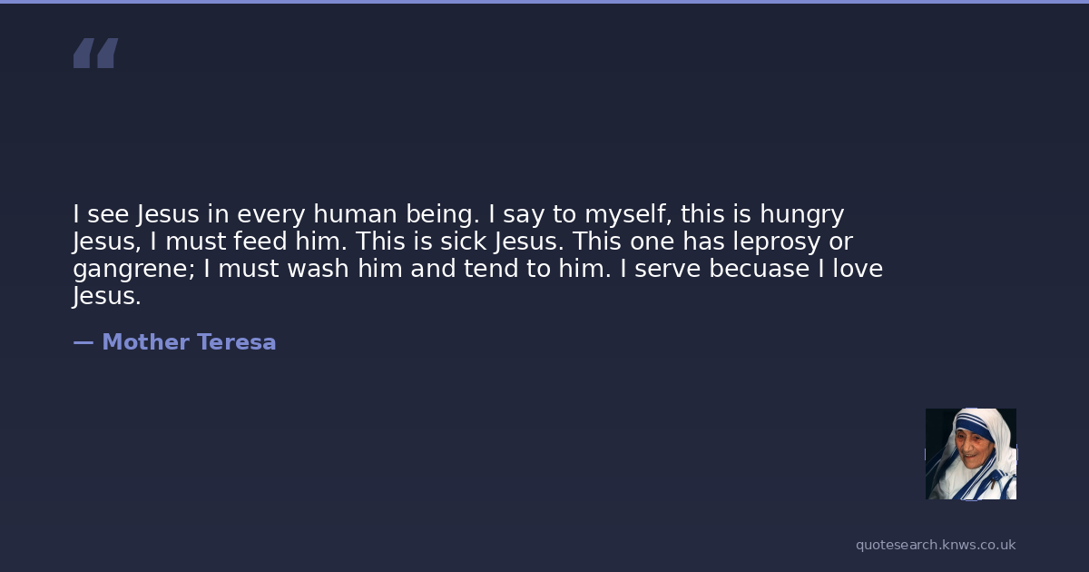 I see Jesus in every human being. I say to myself, this is hungry Jesus, I must feed him. This is sick Jesus. This one has leprosy or gangrene; I must wash him and tend to him. I serve becuase I love Jesus.