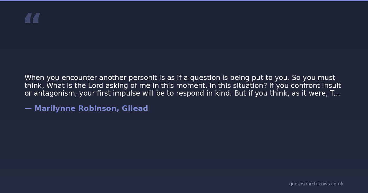 When you encounter another personit is as if a question is being put to you. So you must think, What is the Lord asking of me in this moment, in this situation? If you confront insult or antagonism, your first impulse will be to respond in kind. But if you think, as it were, This is an emissary sent from the Lord, and some benefit is intended for me, first of all the occasion to demonstrate my faithfulness, the chance to show that I do in some small degree participate in the grace that saved me, you are free to act otherwise than as circumstances would seem to dictate. You are free to act by your own lights. You are freed at the same time of the impulse to hate or resent that person. He would probably laugh at the thought that the Lord sent him to you for your benefit (and his), but that is the perfection of the disguise, his own ignorance of itI am reminded of this precious instruction by my own great failure to live up to it recently
