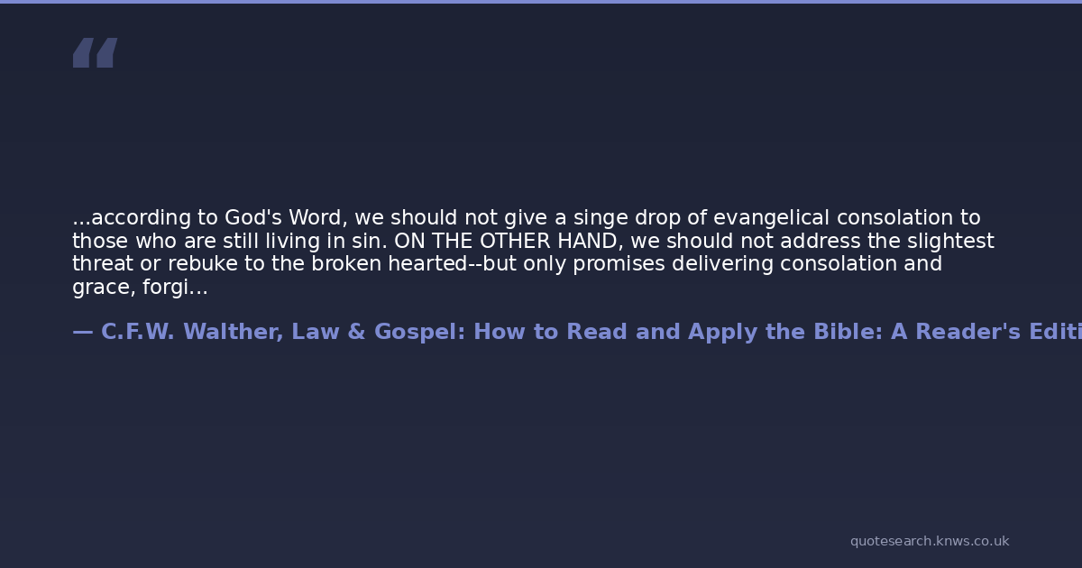 ...according to God's Word, we should not give a singe drop of evangelical consolation to those who are still living in sin. ON THE OTHER HAND, we should not address the slightest threat or rebuke to the broken hearted--but only promises delivering consolation and grace, forgiveness of sin and righteousness. Life and salvation.