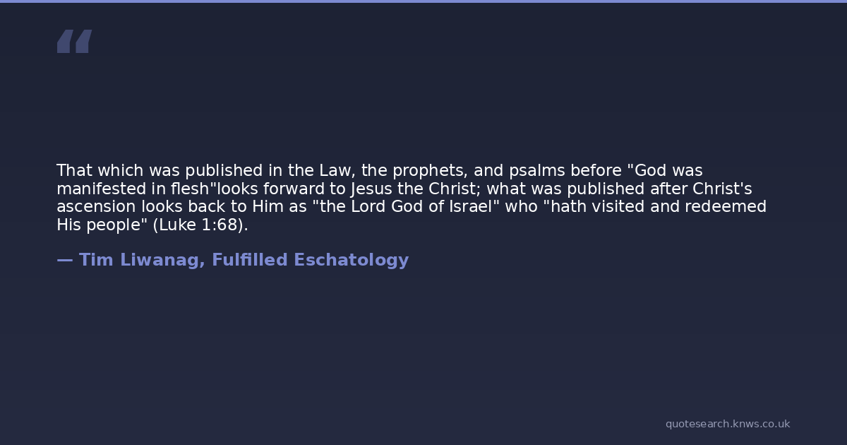 That which was published in the Law, the prophets, and psalms before "God was manifested in flesh"looks forward to Jesus the Christ; what was published after Christ's ascension looks back to Him as "the Lord God of Israel" who "hath visited and redeemed His people" (Luke 1:68).
