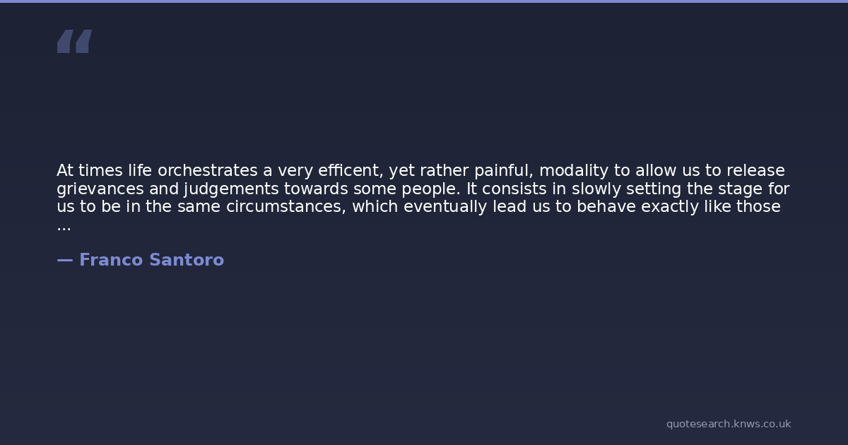 At times life orchestrates a very efficent, yet rather painful, modality to allow us to release grievances and judgements towards some people. It consists in slowly setting the stage for us to be in the same circumstances, which eventually lead us to behave exactly like those people.Each time we express hard judgments regarding what is wrong with others, a complex and long series of events is activated till we reach the moment when we can see our own finger pointing against us.There is also another way, the most efficent and painless, which does not require any complexity and long orchestration, for it simply takes place in the present. It consists in abstaining right from the beginning from any judgement towards others.