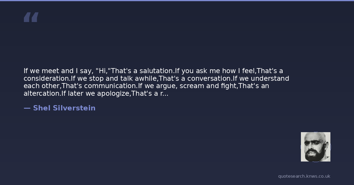 If we meet and I say, "Hi,"That's a salutation.If you ask me how I feel,That's a consideration.If we stop and talk awhile,That's a conversation.If we understand each other,That's communication.If we argue, scream and fight,That's an altercation.If later we apologize,That's a reconciliation.If we help each other home,That's cooperation.And all these ations added upMake civilization.(And if I say this is a wonderful poem, Is that exaggeration?)