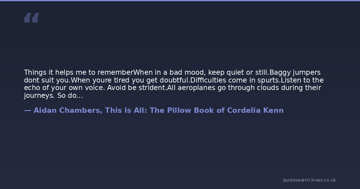 Things it helps me to rememberWhen in a bad mood, keep quiet or still.Baggy jumpers dont suit you.When youre tired you get doubtful.Difficulties come in spurts.Listen to the echo of your own voice. Avoid be strident.All aeroplanes go through clouds during their journeys. So do people during theirs.Often greater clarity comes out of confusion. You have to be puzzled before you find a solution.PMS often brings on a crisis of confidence.Ordinariness is restful.If someone is explosive in front of you, be silent. If you feel explosive, be silent.