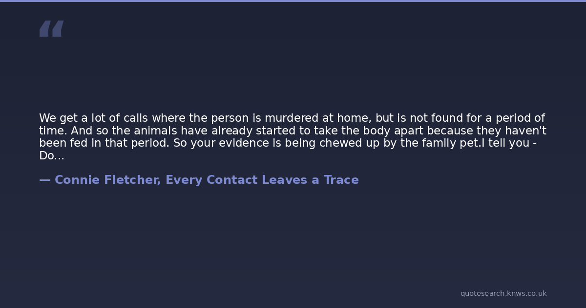 We get a lot of calls where the person is murdered at home, but is not found for a period of time. And so the animals have already started to take the body apart because they haven't been fed in that period. So your evidence is being chewed up by the family pet.I tell you - Dogs are more loyal than cats. Cats will wait only a certain period of time and they'll start chewing on you. Dogs will wait a day or two before they just can't take the starving anymore. So, keep that in mind when choosing a pet. You know how a cat just stares at you, maybe at the top of the TV, from across the room? That's because they're watching to see if you're gonna stop breathing.