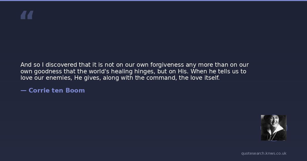 And so I discovered that it is not on our own forgiveness any more than on our own goodness that the world's healing hinges, but on His. When he tells us to love our enemies, He gives, along with the command, the love itself.