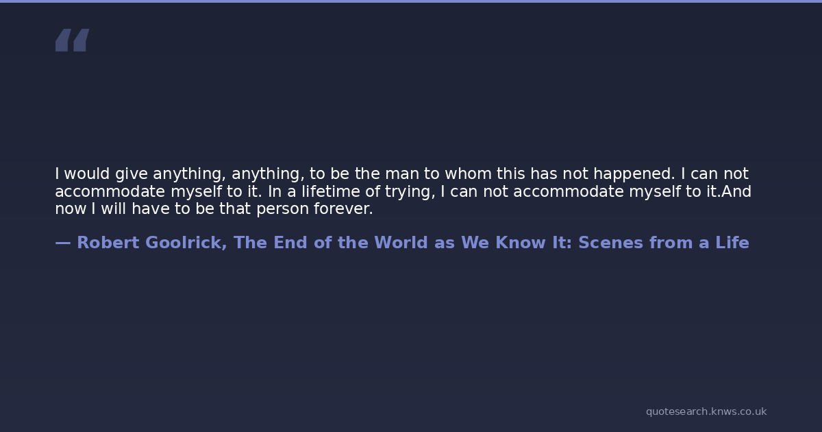 I would give anything, anything, to be the man to whom this has not happened. I can not accommodate myself to it. In a lifetime of trying, I can not accommodate myself to it.And now I will have to be that person forever.