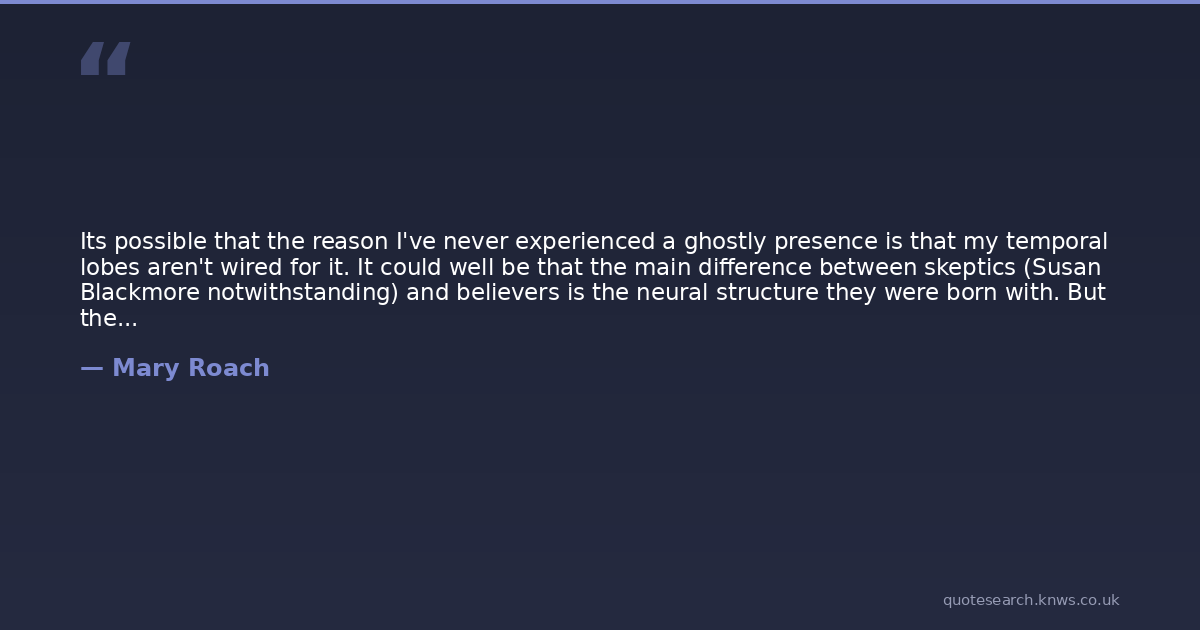 Its possible that the reason I've never experienced a ghostly presence is that my temporal lobes aren't wired for it. It could well be that the main difference between skeptics (Susan Blackmore notwithstanding) and believers is the neural structure they were born with. But the question still remains: Are these people whose EMF-influenced brains alert them to presences picking up something real that the rest of us cant pick up, or are they hallucinating? Here again, we must end with the Big Shrug, a statue of which is being erected on the lawn outside my office.