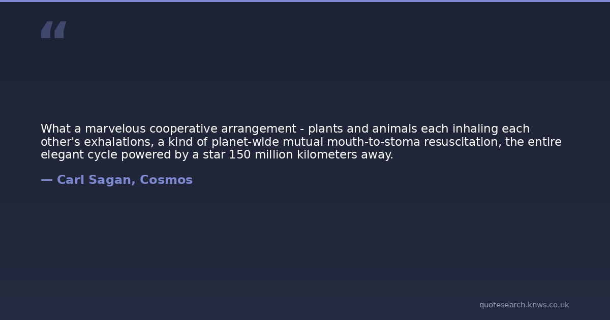 What a marvelous cooperative arrangement - plants and animals each inhaling each other's exhalations, a kind of planet-wide mutual mouth-to-stoma resuscitation, the entire elegant cycle powered by a star 150 million kilometers away.