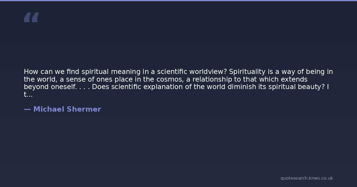 How can we find spiritual meaning in a scientific worldview? Spirituality is a way of being in the world, a sense of ones place in the cosmos, a relationship to that which extends beyond oneself. . . . Does scientific explanation of the world diminish its spiritual beauty? I think not. Science and spirituality are complementary, not conflicting; additive, not detractive. Anything that generates a sense of awe may be a source of spirituality. Science does this in spades. (158-159)