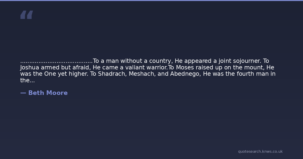 ........................................To a man without a country, He appeared a joint sojourner. To Joshua armed but afraid, He came a valiant warrior.To Moses raised up on the mount, He was the One yet higher. To Shadrach, Meshach, and Abednego, He was the fourth man in the fire.To Elijah who stood as one for God, he was never less alone. For Noah's faithful family, He made an ark their home. To Ezekiel He appeared to be the light cast over the dark. To King David running from the throne, He was the true Monarch. To Daniel at the bite of death, He was the lock upon their jaws. To King Solomon who'd had it all, He was the only worthy cause. To a sinking fisherman, He was life upon the water. To a grieving Jairus, He was life unto his daughter.To a woman at the well, He was complete acceptance. To a doubting Thomas, He was the proof for his reluctance. To a dozen throwbacks from the world, He unleashed His awesome power. From a greedy grave of several days burst forth his finest hour.........................................