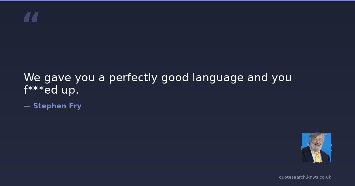 Stephen Fry was a 20th-century English actor, comedian and presenter. Sir Stephen John Fry is a British actor, broadcaster, comedian, and writer. He began his career on the sketch comedy series Alfresco (1983–1984) and the sitcom Blackadder (1986–1989), before gaining recognition as part of the comedy duo Fry and Laurie alongside Hugh Laurie, appearing together in A Bit of Fry & Laurie (1989–1995) and Jeeves and Wooster (1990–1993). Read more on Wikipedia →