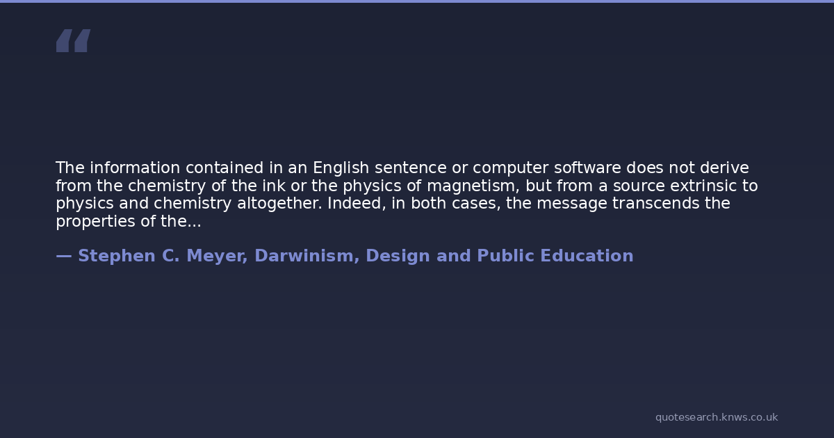 The information contained in an English sentence or computer software does not derive from the chemistry of the ink or the physics of magnetism, but from a source extrinsic to physics and chemistry altogether. Indeed, in both cases, the message transcends the properties of the medium. The information in DNA also transcends the properties of its material medium.