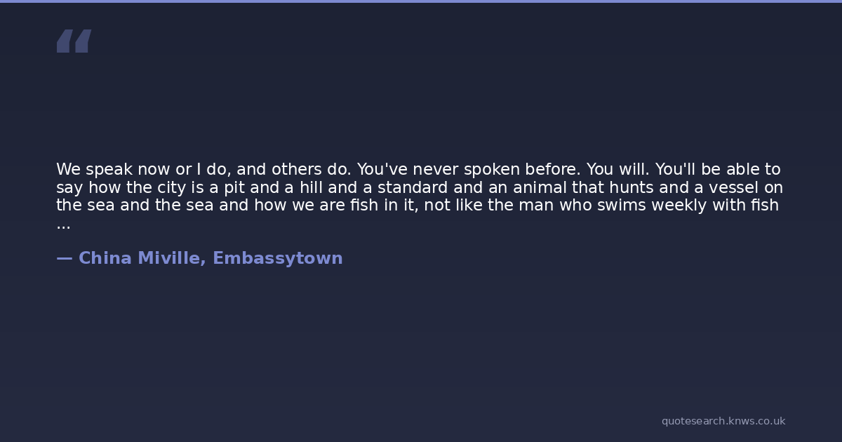 We speak now or I do, and others do. You've never spoken before. You will. You'll be able to say how the city is a pit and a hill and a standard and an animal that hunts and a vessel on the sea and the sea and how we are fish in it, not like the man who swims weekly with fish but the fish with which he swims, the water, the pool. I love you, you light me, warm me, you are suns.You have never spoken before.
