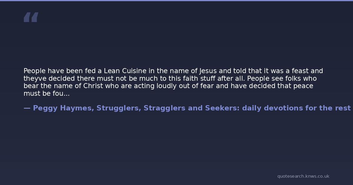 People have been fed a Lean Cuisine in the name of Jesus and told that it was a feast and theyve decided there must not be much to this faith stuff after all. People see folks who bear the name of Christ who are acting loudly out of fear and have decided that peace must be found elsewhere. People are hungry to be a part of something that matters and to know that they matter.