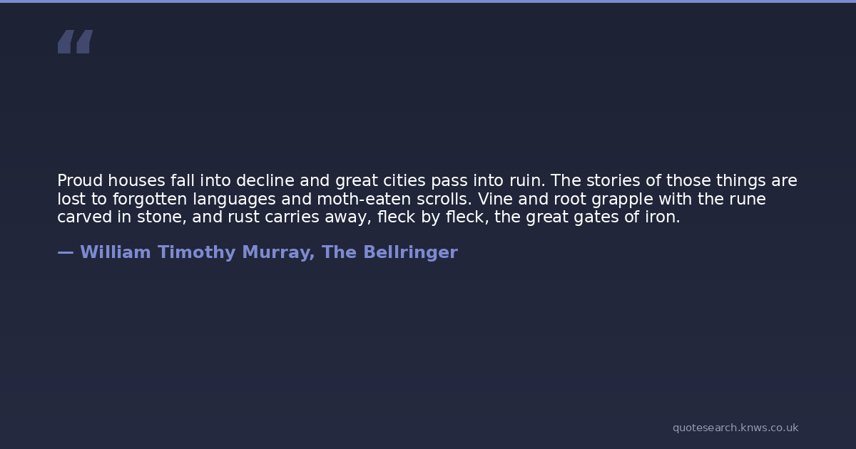 Proud houses fall into decline and great cities pass into ruin. The stories of those things are lost to forgotten languages and moth-eaten scrolls. Vine and root grapple with the rune carved in stone, and rust carries away, fleck by fleck, the great gates of iron.