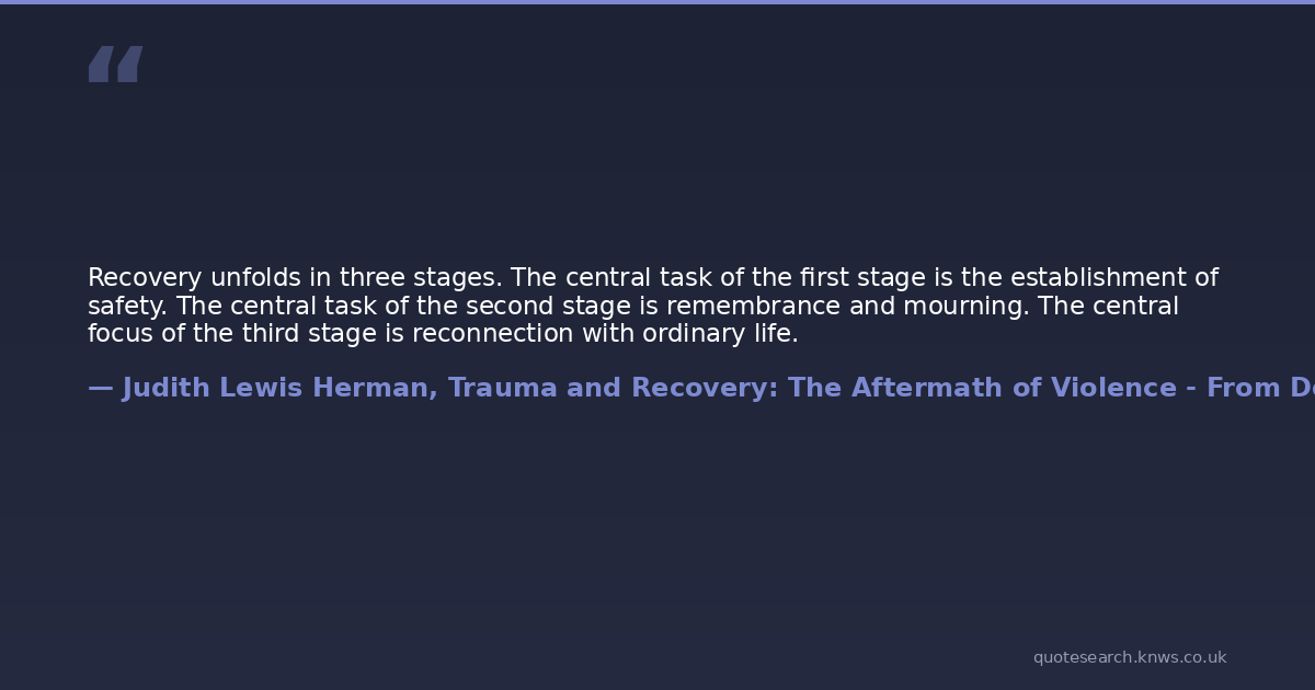 Recovery unfolds in three stages. The central task of the first stage is the establishment of safety. The central task of the second stage is remembrance and mourning. The central focus of the third stage is reconnection with ordinary life.