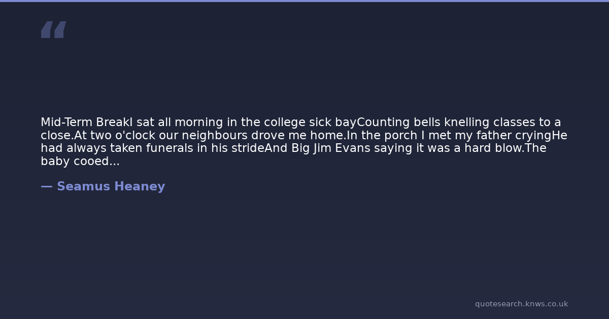 Mid-Term BreakI sat all morning in the college sick bayCounting bells knelling classes to a close.At two o'clock our neighbours drove me home.In the porch I met my father cryingHe had always taken funerals in his strideAnd Big Jim Evans saying it was a hard blow.The baby cooed and laughed and rocked the pramWhen I came in, and I was embarrassedBy old men standing up to shake my handAnd tell me they were 'sorry for my trouble'.Whispers informed strangers I was the eldest,Away at school, as my mother held my handIn hers and coughed out angry tearless sighs.At ten o'clock the ambulance arrivedWith the corpse, stanched and bandaged by the nurses.Next morning I went up into the room. SnowdropsAnd candles soothed the bedside; I saw himFor the first time in six weeks. Paler now,Wearing a poppy bruise on his left temple,He lay in the four-foot box as in his cot.No gaudy scars, the bumper knocked him clear.A four-foot box, a foot for every year.