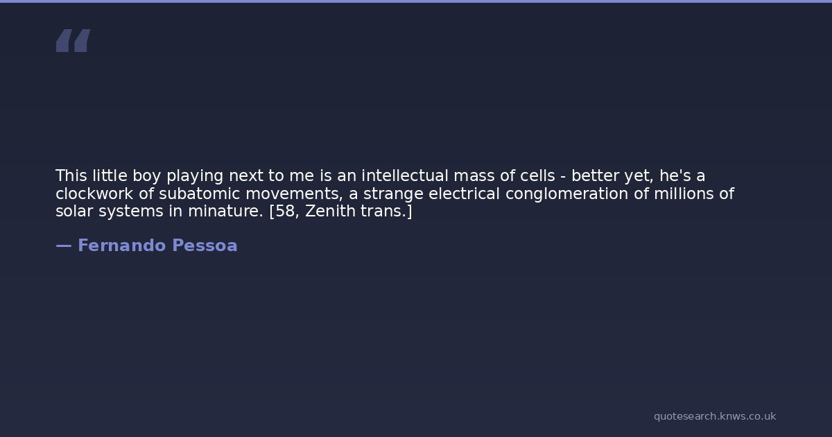 This little boy playing next to me is an intellectual mass of cells - better yet, he's a clockwork of subatomic movements, a strange electrical conglomeration of millions of solar systems in minature. [58, Zenith trans.]