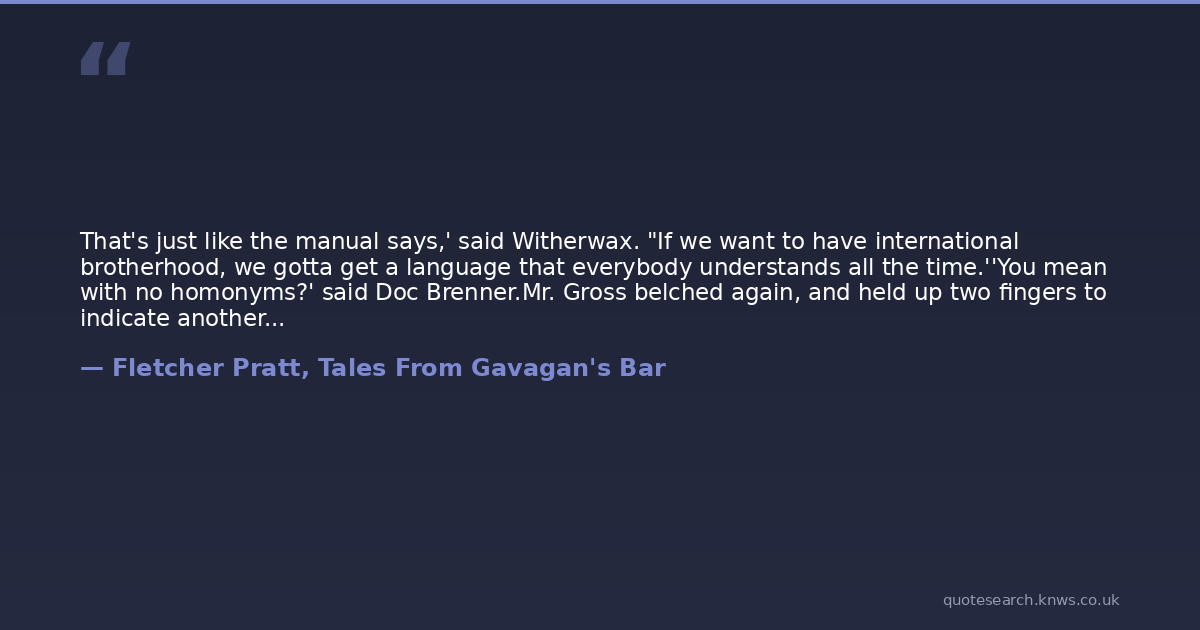 That's just like the manual says,' said Witherwax. "If we want to have international brotherhood, we gotta get a language that everybody understands all the time.''You mean with no homonyms?' said Doc Brenner.Mr. Gross belched again, and held up two fingers to indicate another Boilermaker. 'Are you saying that the language a fella speaks can make a fairy of him?' ("Gin Comes In Bottles")