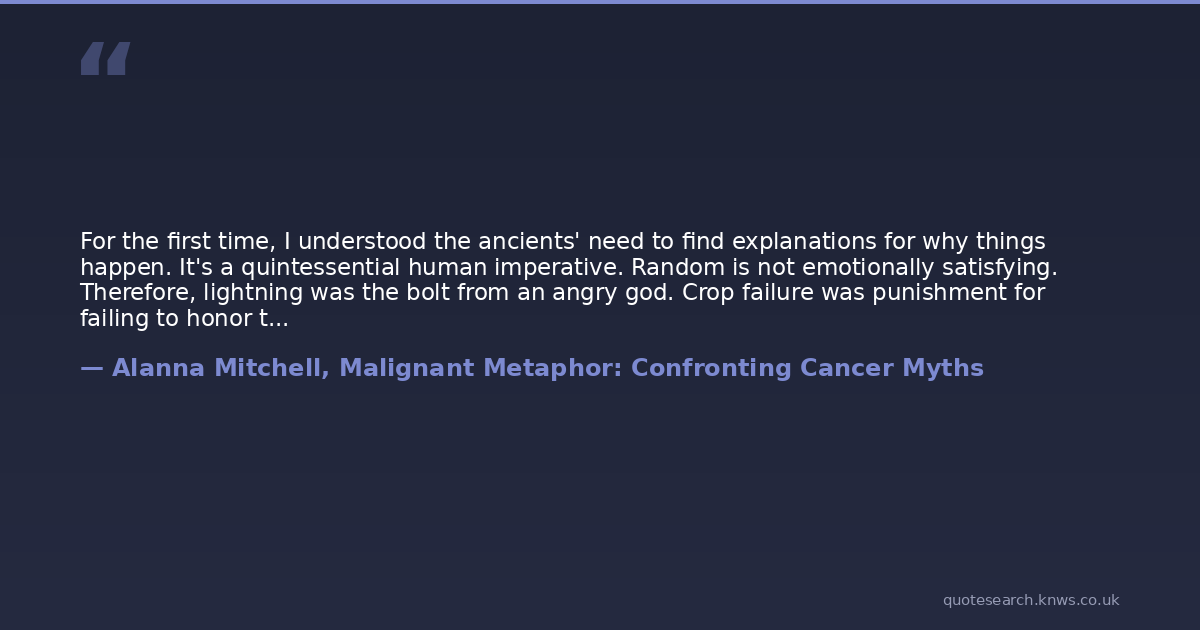 For the first time, I understood the ancients' need to find explanations for why things happen. It's a quintessential human imperative. Random is not emotionally satisfying. Therefore, lightning was the bolt from an angry god. Crop failure was punishment for failing to honor the gods with a fatted calf. The plague happened because you took the Lord's name in vain or coveted your neighbor's wife. Going to church regularly and praying could forestall illness. And on and on.