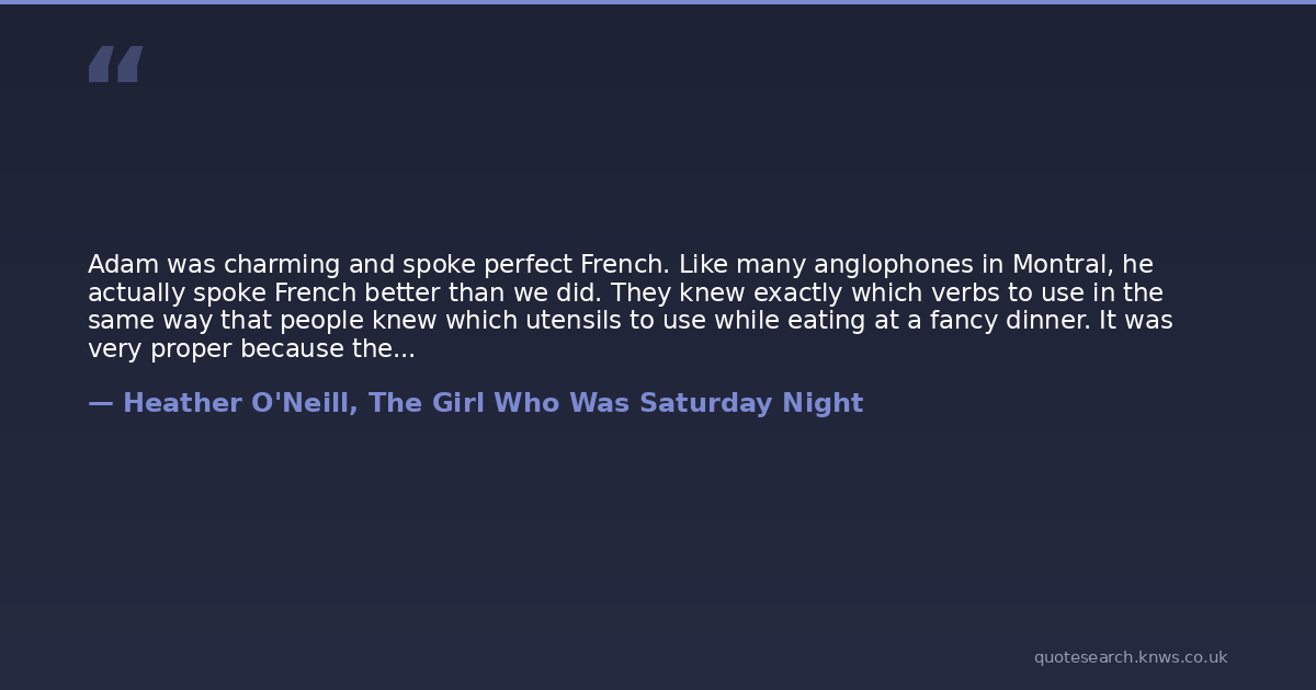 Adam was charming and spoke perfect French. Like many anglophones in Montral, he actually spoke French better than we did. They knew exactly which verbs to use in the same way that people knew which utensils to use while eating at a fancy dinner. It was very proper because they learned it from books. They didnt know slang or how to curse. They didnt know how to do anything other than be proper and reserved. It was state-sponsored, dry-clean-only French.