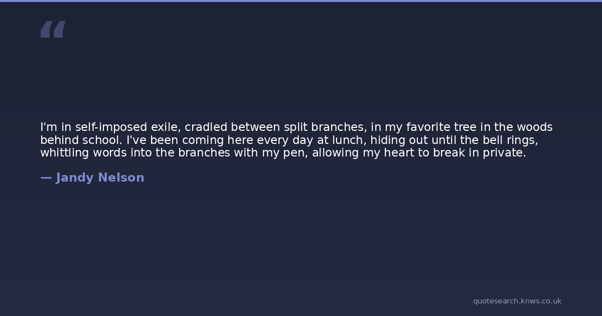 I'm in self-imposed exile, cradled between split branches, in my favorite tree in the woods behind school. I've been coming here every day at lunch, hiding out until the bell rings, whittling words into the branches with my pen, allowing my heart to break in private.
