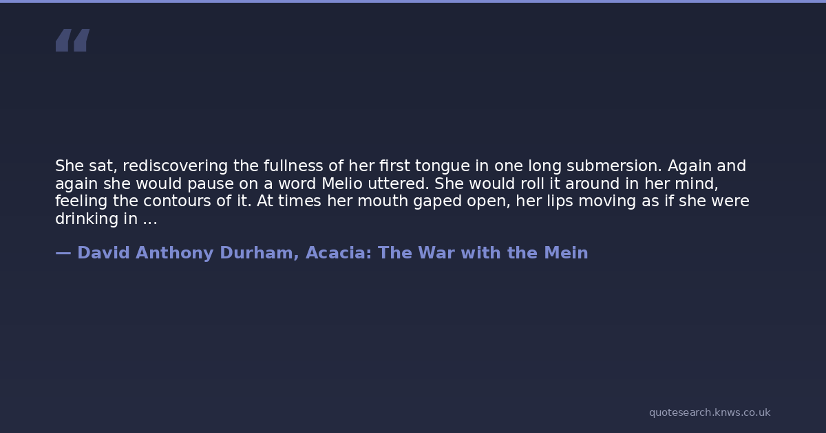 She sat, rediscovering the fullness of her first tongue in one long submersion. Again and again she would pause on a word Melio uttered. She would roll it around in her mind, feeling the contours of it. At times her mouth gaped open, her lips moving as if she were drinking in his words instead of breathing.