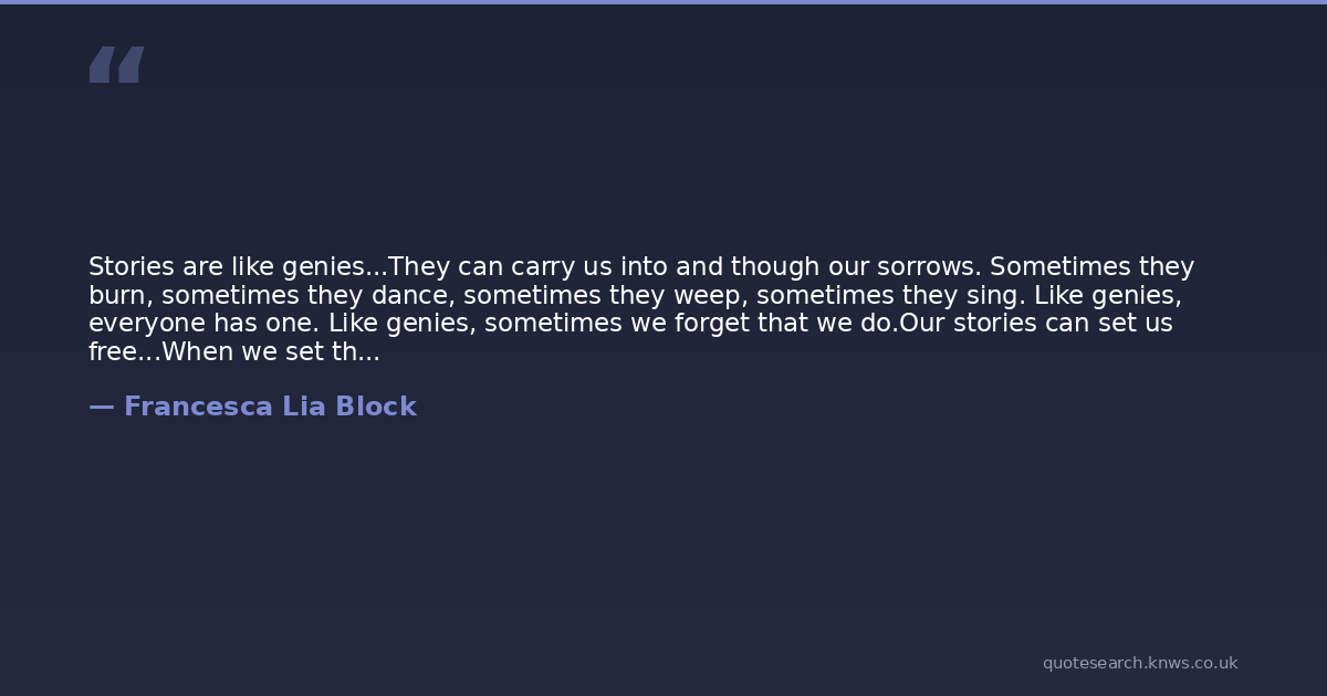 Stories are like genies...They can carry us into and though our sorrows. Sometimes they burn, sometimes they dance, sometimes they weep, sometimes they sing. Like genies, everyone has one. Like genies, sometimes we forget that we do.Our stories can set us free...When we set them free.