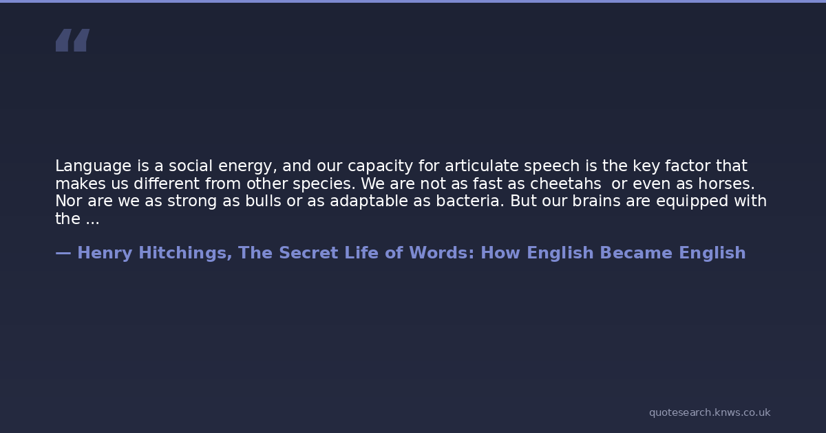 Language is a social energy, and our capacity for articulate speech is the key factor that makes us different from other species. We are not as fast as cheetahs or even as horses. Nor are we as strong as bulls or as adaptable as bacteria. But our brains are equipped with the facility to produce and process speech, and we are capable of abstract thought. A bee may dance to show other bees the location of a source of food, a green monkey may deliver sophisticated vocal signals, and a sparrow may manage as many as thirteen different types of song, but an animal's system of communication has a limited repertoire; ours, on the other hand, is 'open', and its mechanisms permit a potentially infinite variety of utterances.