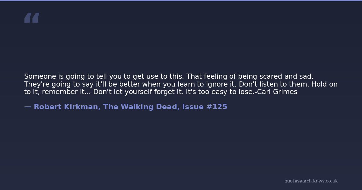 Someone is going to tell you to get use to this. That feeling of being scared and sad. They're going to say it'll be better when you learn to ignore it. Don't listen to them. Hold on to it, remember it... Don't let yourself forget it. It's too easy to lose.-Carl Grimes