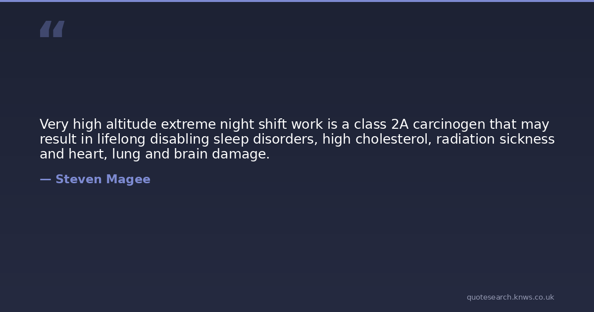 Very high altitude extreme night shift work is a class 2A carcinogen that may result in lifelong disabling sleep disorders, high cholesterol, radiation sickness and heart, lung and brain damage.