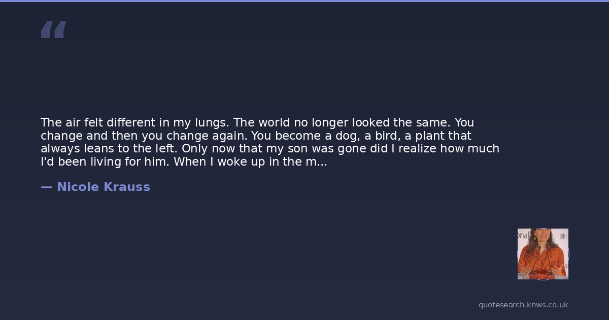 The air felt different in my lungs. The world no longer looked the same. You change and then you change again. You become a dog, a bird, a plant that always leans to the left. Only now that my son was gone did I realize how much I'd been living for him. When I woke up in the morning it was because he existed, and when I ordered food in the night it was because he existed, and when I wrote my book it was because he existed to read it.