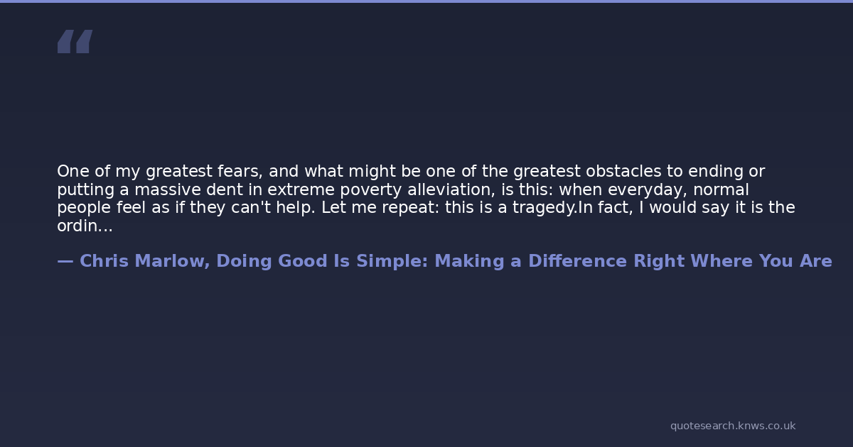 One of my greatest fears, and what might be one of the greatest obstacles to ending or putting a massive dent in extreme poverty alleviation, is this: when everyday, normal people feel as if they can't help. Let me repeat: this is a tragedy.In fact, I would say it is the ordinary people who will determine how much impact is done in the world. It's the ordinary folks who have a great responsibility. If individuals like you and me decide in our hearts to be deliberate and care for the poor, there is no doubt we can truly see the majority of extreme poverty vanish into thin air.
