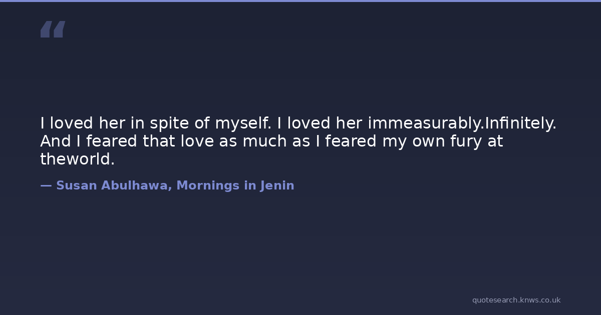 I loved her in spite of myself. I loved her immeasurably.Infinitely. And I feared that love as much as I feared my own fury at theworld.