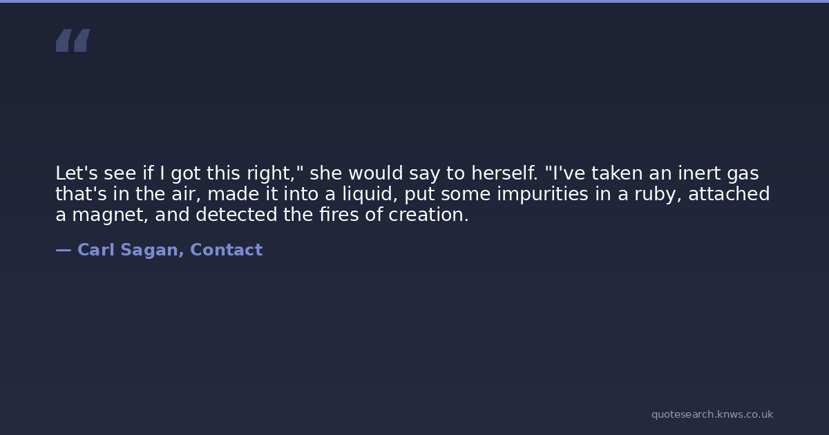 Let's see if I got this right," she would say to herself. "I've taken an inert gas that's in the air, made it into a liquid, put some impurities in a ruby, attached a magnet, and detected the fires of creation.